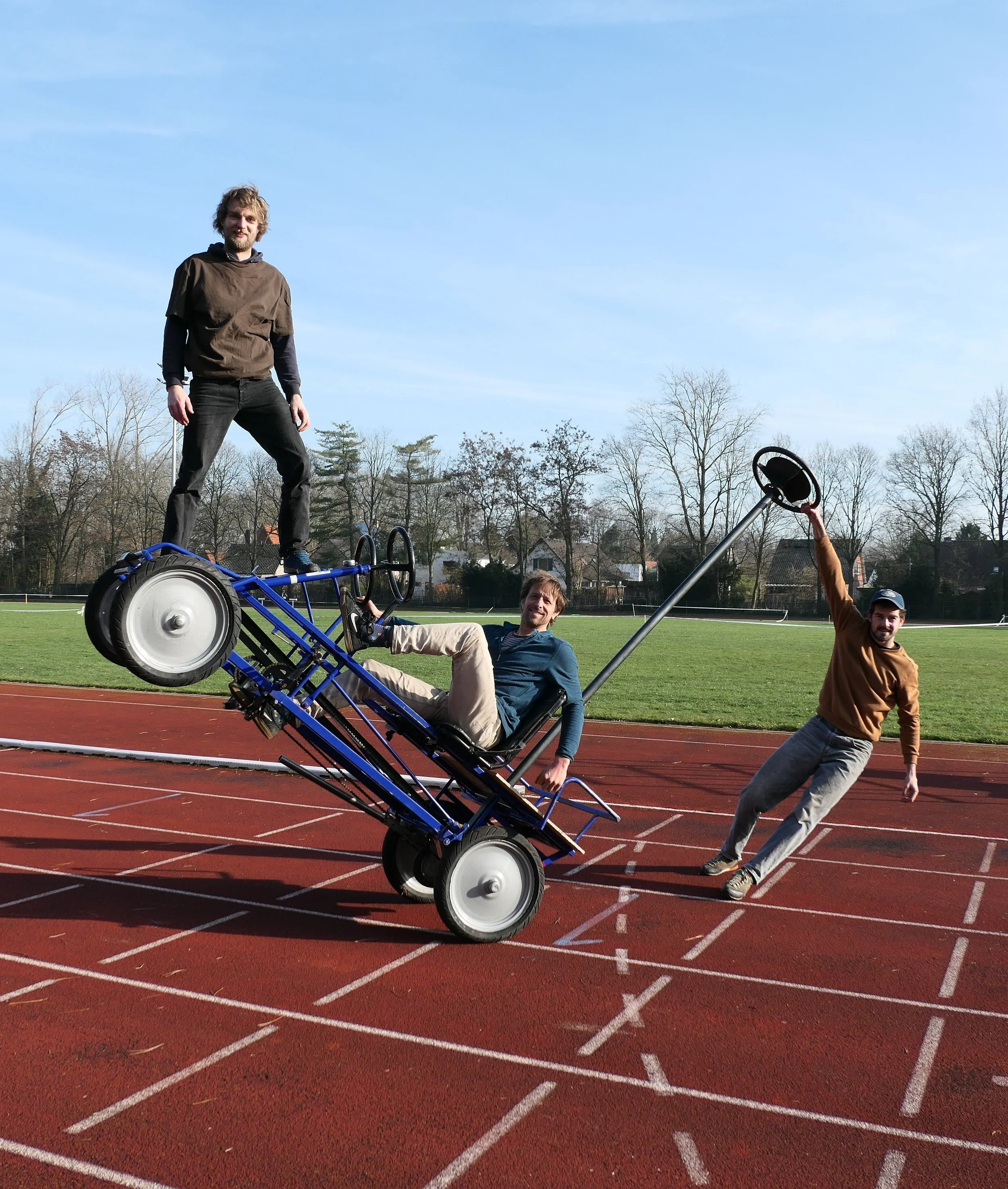 Two lunar travellers and a street musician arrive in a space, where people have gathered by invitation. One of the characters carries a wooden plank too large and too heavy for her. Some step closer to help her carry it. The plank circulate from hand to hand, reshaping the crowd. As more arms arrive to help, she steps onto it, supported by the spectators below. In this shared experience, we dive into a trip that shifts our perspectives and moves us closer to one another.